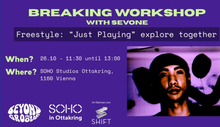 Am 26.10. von 11:30 bis 13:00 Uhr findet ein Dance Workshop mit Michi Vo aka Sevone statt. Der Workshop trägt den Titel „Just Playing“ und dreht sich ums gemeinsame Erkunden.